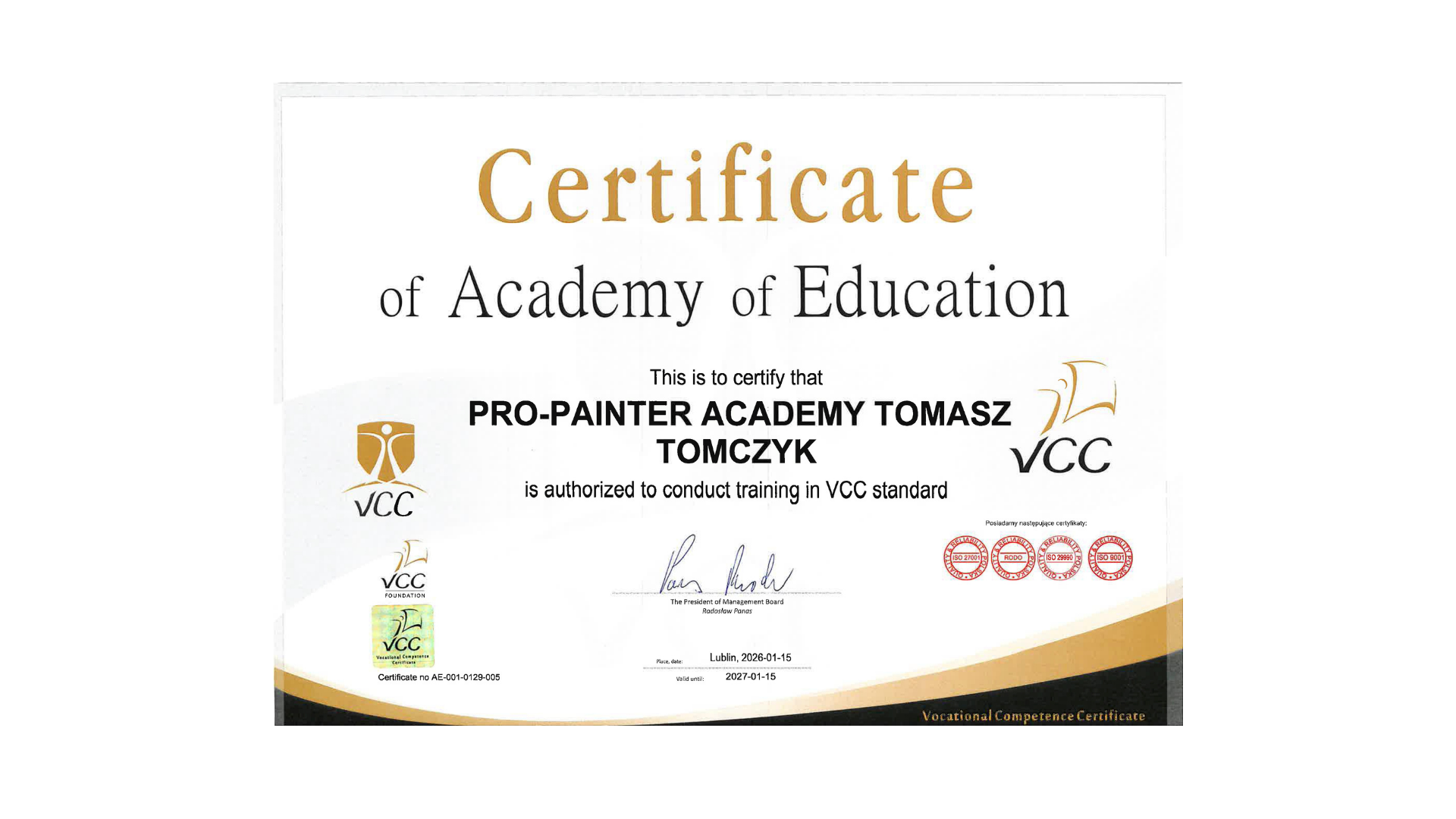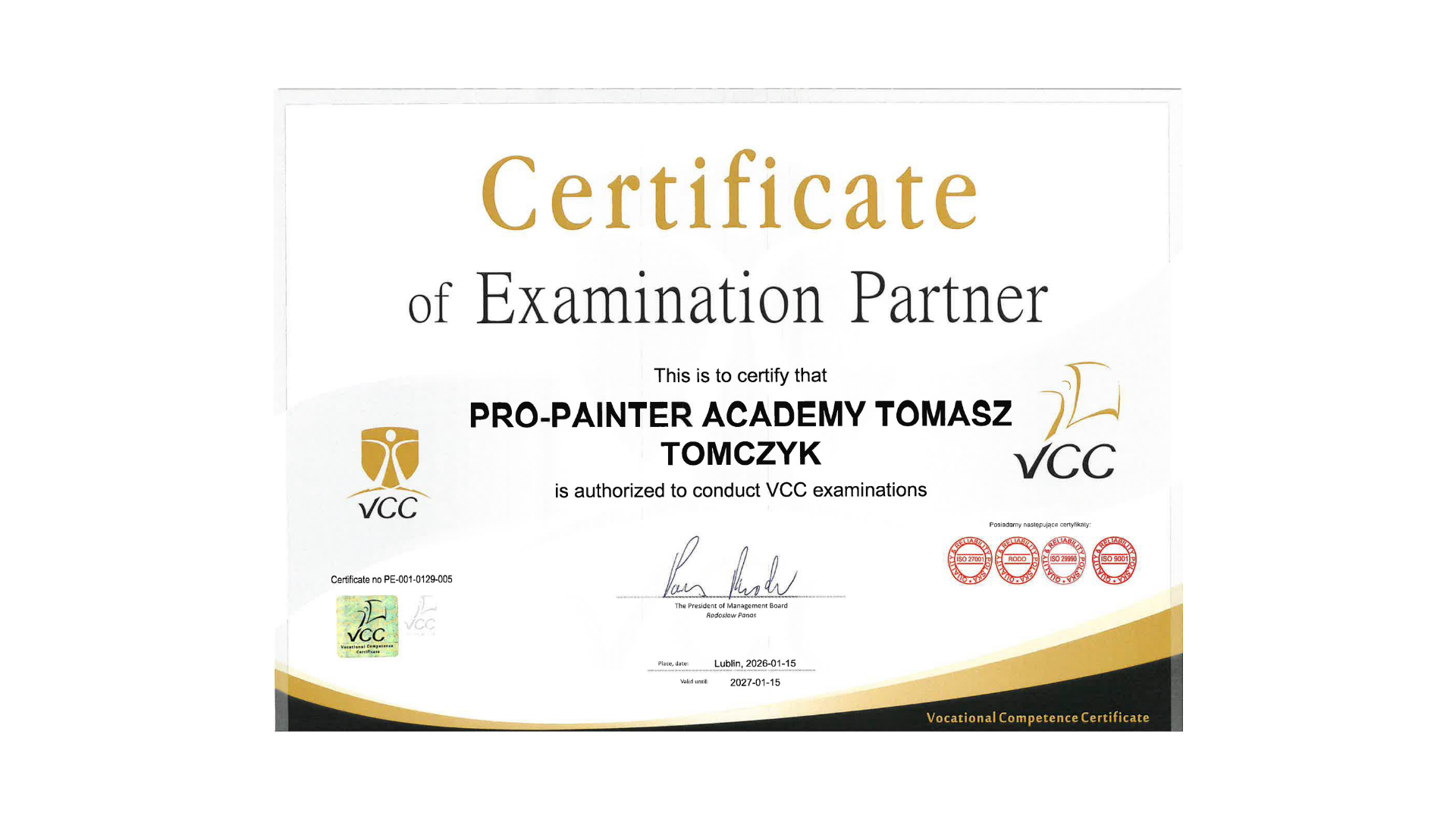 Firma PRO-PAINTER ACADEMY posiada akredytację i status Akademii Edukacyjnej VCC (oraz Partnera Egzaminacyjnego VCC).